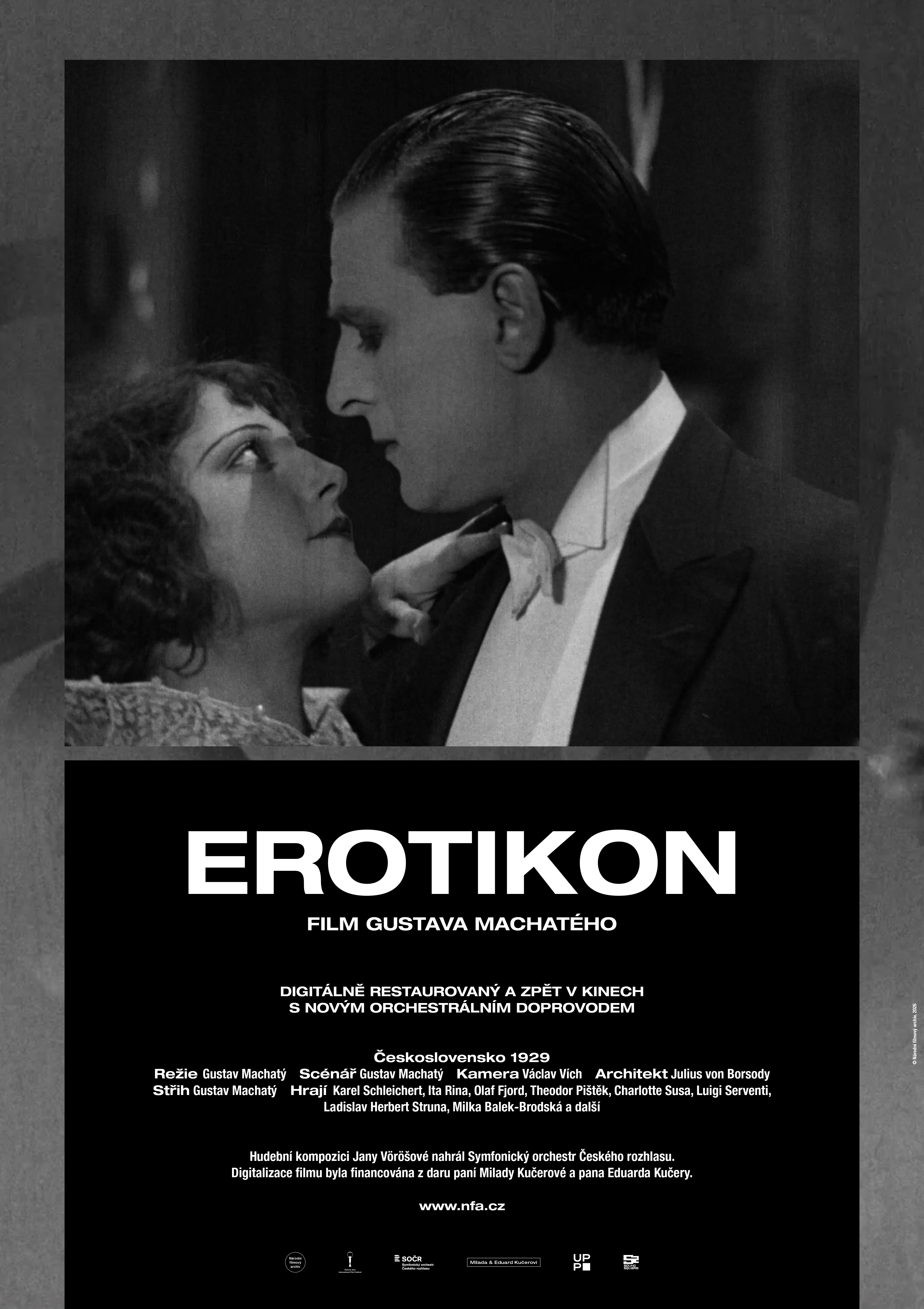The first screening of Erotikon took place at a semi-private event in Prague on the 27th of February 1929. In July of the same year, Erotikon entered wider cinematic distribution with several shots removed due to censorship. The goal of this restoration was to get as close as posiible to the uncensored February 1929 version.