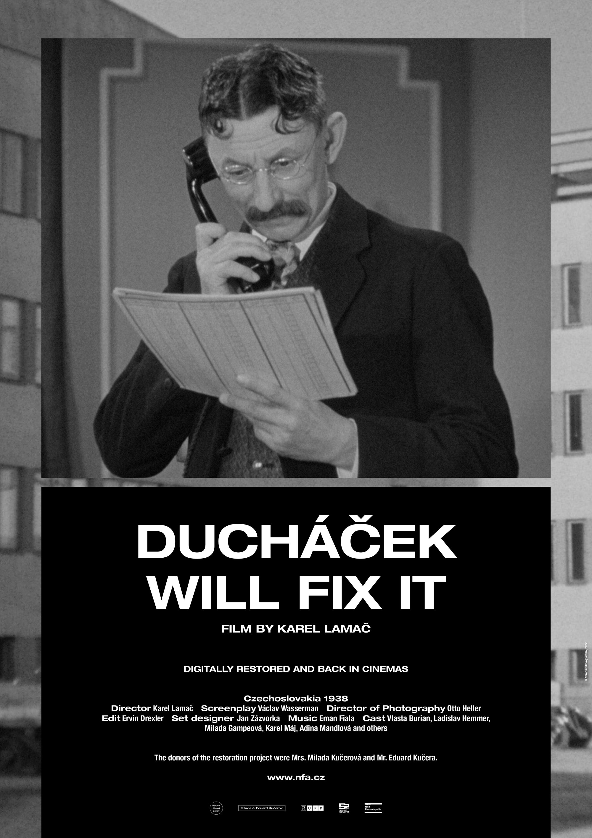 Vlasta Burian owed some of his most famous film roles to director Karel Lamač, who was involved in shaping the comedian's star image in the 1930s. Their second to last work together was the still-fresh and cheerful comedy called Mr. Ducháček Will Fit It (1938). It is a freely adapted play by Austrian authors Rudolf Österreicher and Rudolf Bernauer, Konto X. The screenwriter Václav Wasserman was inspired mainly by its staging at the Vlasta Burian Theatre. The protagonist is a shrewd accountant and ironic glossator of social life, Jan Damián Ducháček (Vlasta Burian), who helps his boss Faukner (Ladislav Hemmer), a lawyer who represents an indebted family, with financial and personal problems. Faukner's partner, Julia, was played by Adina Mandlová, who also appeared in Burian and Lamac's last film, the comedy He Stood at the Till (1939).