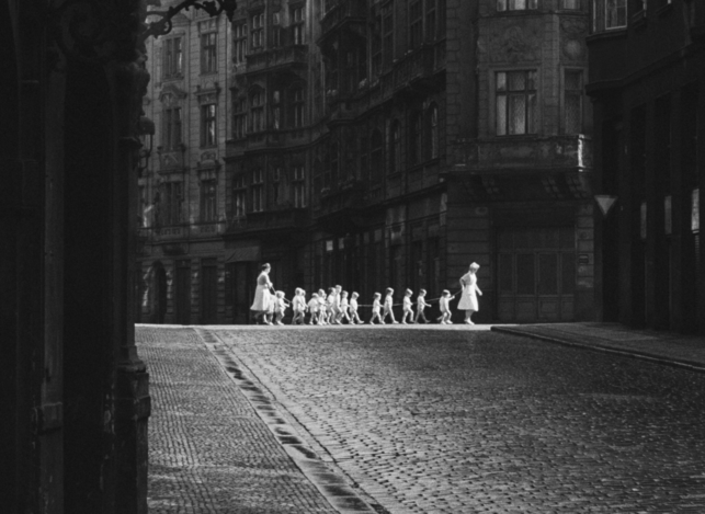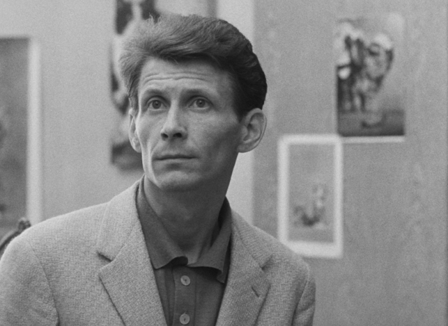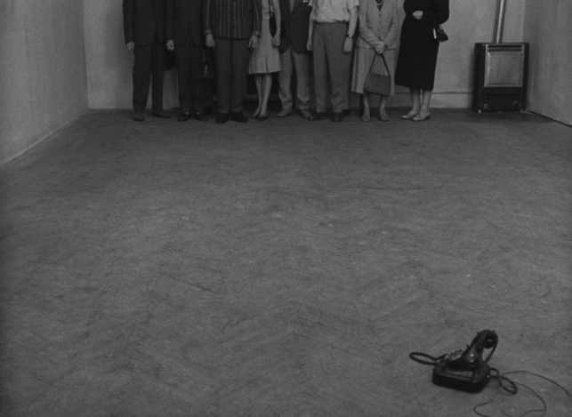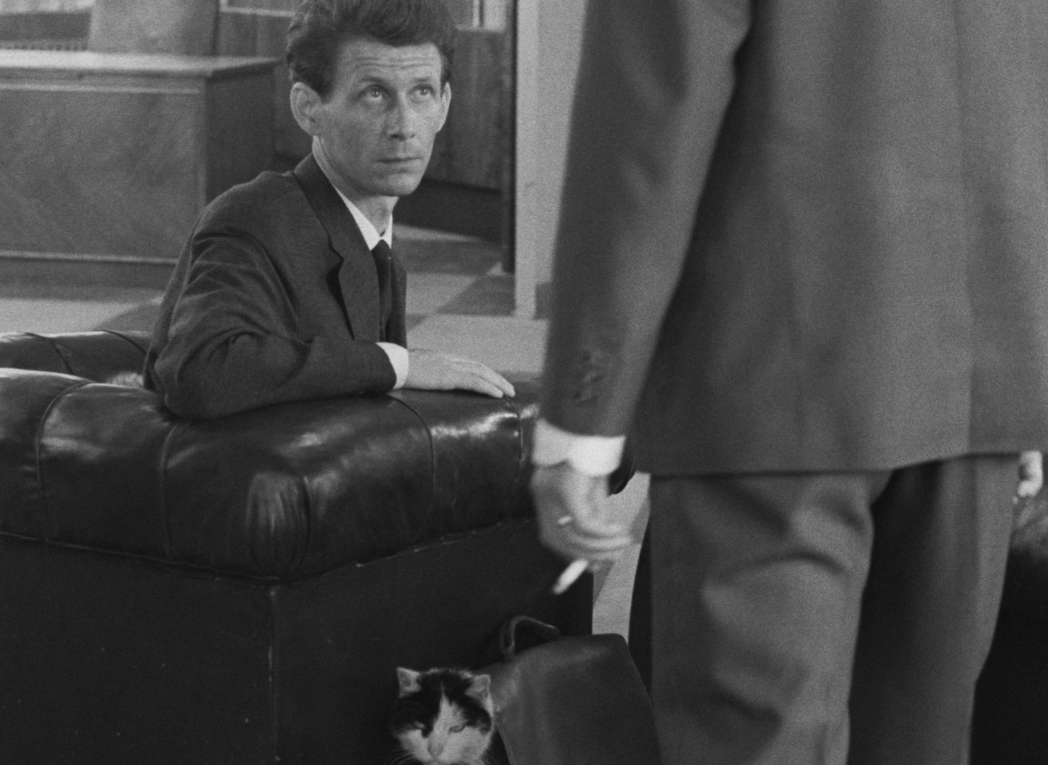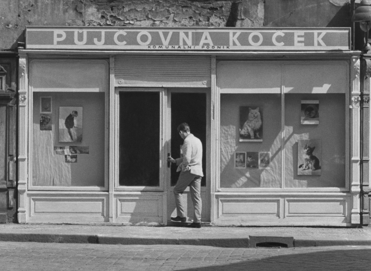 “In one word, describe the difference between man and animal.” “Reason?” “No! Discipline!” The allegorical motion picture, Joseph Kilian, rousingly exposes how human obsession with order leaves him sour and dull. The central character, a man who, having leased a feline companion for a single day, laboriously tries to return him the next to avoid a fine and in the process, experiences endless drama. The rental shop is nowhere to be found so the man, with the cat in his briefcase, treads through a labyrinth of hallways, waiting rooms and offices, finally growing accustomed to his burden. Joseph Kilian is a middle length film shot by the creators in perfect Kafkaesque style. Kafka has been back in fashion for some time in Czechoslovakia; it is of great significance that he has been reevaluated in his homeland […] Everything is narrated in an entertaining manner with humor that penetrates through the images. Postava k podpírání is one of the most successful films we have seen in some time. [“Křik”, “O něčem jiném”, “Postava k podpírání” in the Italian Press. Czechoslovakian Cinematographey in the Light of the Foreign Press.1964, no. 9, pg. 21.]