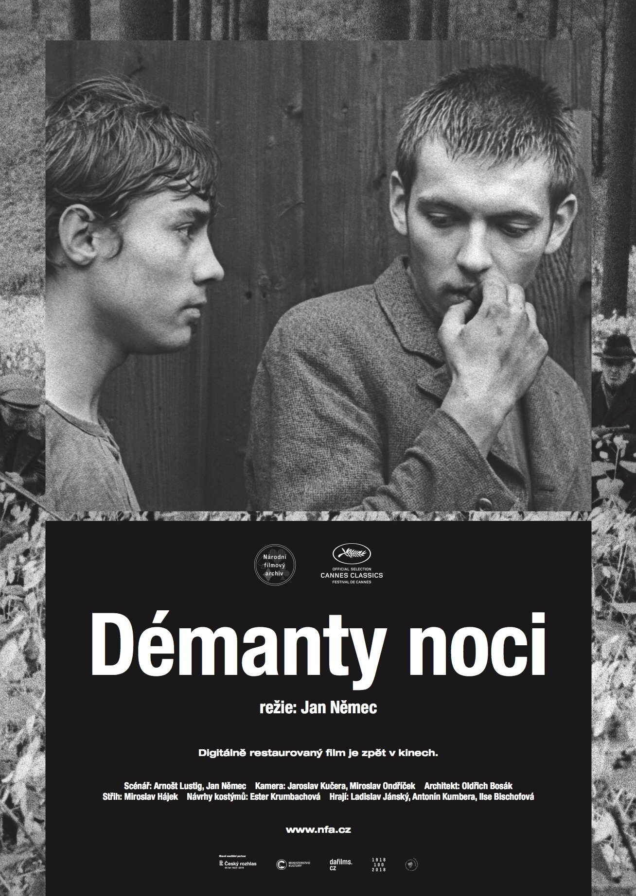 In winning the Grand Prix at the Mannheim-Heidelberg International Film Festival (IFFMH) in 1964, Jan Němec’s drama Démanty noci (Diamonds of the Night) became the first Czechoslovak New Wave film to receive an internationally recognised award. The motion picture, based on a short story from an eponymous book by Arnošt Lustig, started the brilliant career of one of the most original Czech filmmakers of the 1960s (Němec had adapted one other Lustig short story, Sousto (Mouthful), as a short film while graduating at Prague film school FAMU). Diamonds of the Night offers an unusual, intensely attitudinal insight into the topic of war. It tells the story of two young Jewish men who escape from a train taking them to their death. The film amounts to a naturalistic study of endangerment, repudiation and uprootedness. The experiences of the desperate refugees in the Sudetenland forest merge with the memories, dreams and visions of one of the men. Thus the anatomy of a tortured human soul is projected into the sphere of existential drama.