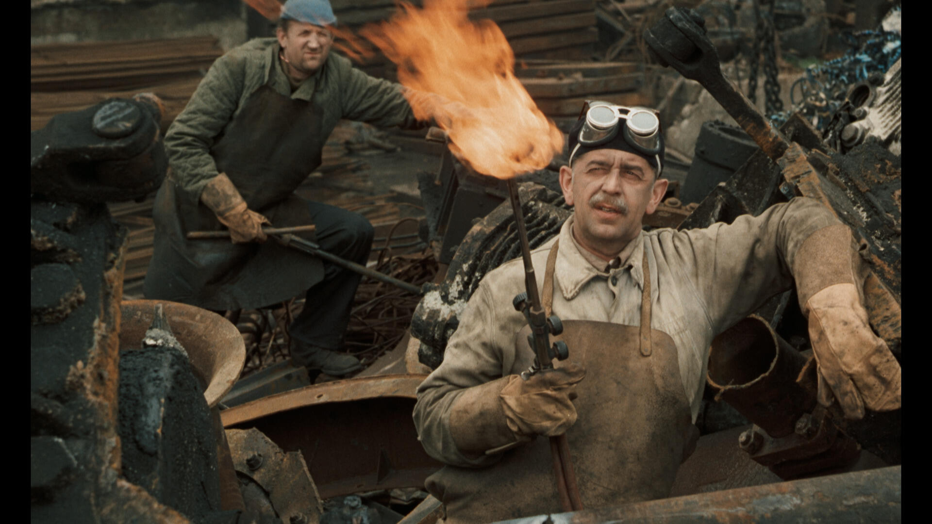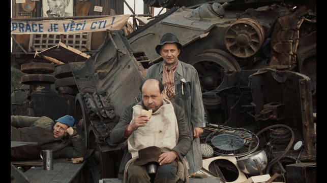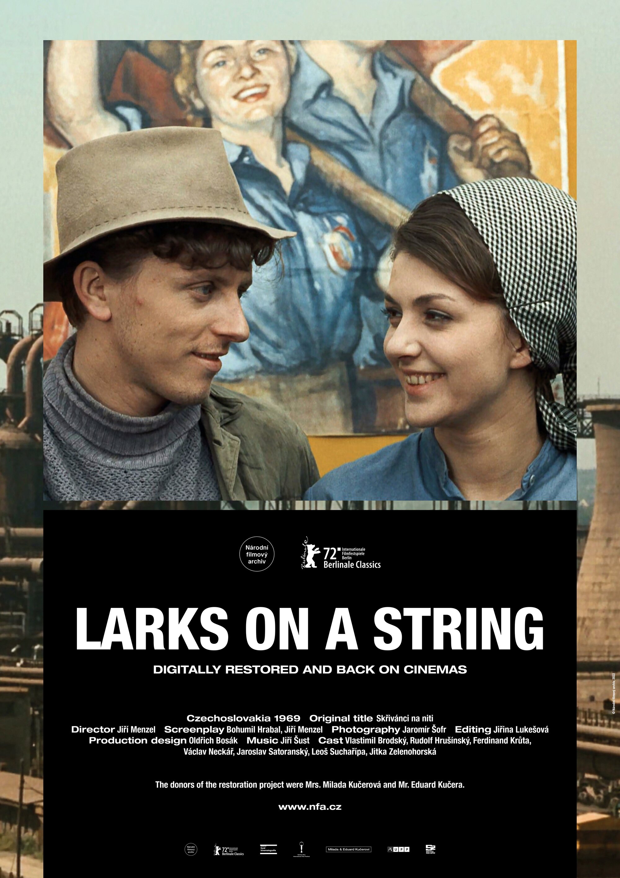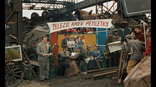 The stories of Bohumil Hrabal were a touchstone for director Jiří Menzel. By the time he turned to Skřivánci na niti (Skylarks on the String, 1969) he had already adapted a number of short stories from the writer’s 1965 collection Inzerát na dům, ve kterém už nechci bydlet (An Advertisement for the House I No Longer Wish to Live in). After Smrt pana Baltazara (The Death of Mr Balthazar, 1965) – which served as a short film segment of the anthology feature Perličky na dně (Pearls of the Deep, 1965), a motion picture sometimes described as a manifesto of sorts for the 1960s Czechoslovak New Wave generation of directors – Menzel turned to the wartime tragicomedy Ostře sledované vlaky (Closely Watched Trains, 1966). Its success was underscored by a Best Foreign Language Film Oscar. Skylarks on the String was another winning collaboration between the highly regarded filmmaker and the much admired writer. The film is set in Kladno steelworks, a place where political offenders against the communist regime were sent for “temporary employment”. These might include insubordinate intellectuals, religious affiliates or small traders. The temporary workers in the film include a former state prosecutor (Leoš Suchařípa), a young Adventist named Pavel (Václav Neckář), his love and fellow inmate Jitka (Jitka Zelenohorská) and the barber Kudla (Ferdinand Krůta). All are watched over by the young guard Anděl (Jaroslav Satoranský) who has also been charged with keeping an eye on the “hill girls” – women who try to cross over the country’s mountainous western borders. Although the main protagonists are all in the same boat, friendship and mutual loyalty have their limitations when there is no chance of justice and no way to appeal for help. A fanatical leader of a communist youth organisation points out the “enemies of the regime” to visiting Pioneers (the socialists’ favoured term for “scouts) as if they are contagious exotic animals. Even though things can always get worse, life never ceases to be both strange and beautiful… Rather than being greeted by popular acclaim, plaudits from critics and awards from international film festivals, the film instead ended up in the infamous “censor’s vault”. There was little appetite for storylines exploring the theme of 1950s’ political persecution in a Czechoslovak film industry that was busy adapting itself to the demands of post-1968 “normalisation”. A scene featuring senile government minister Zdeněk Nejedlý (Vladimír Šmeral) was cut but it was still not enough to placate the censor. The film was only premiered after November 1989 and although it earned its creator a Golden Bear at the 1990 Berlin International Film Festival it was a belated satisfaction. After Skylarks on the String, Menzel was not permitted to make another film for five years. His next offering was a essentially a socialist propaganda piece about the builders of a better future, Kdo hledá zlaté dno (Who Looks for Gold, 1974).