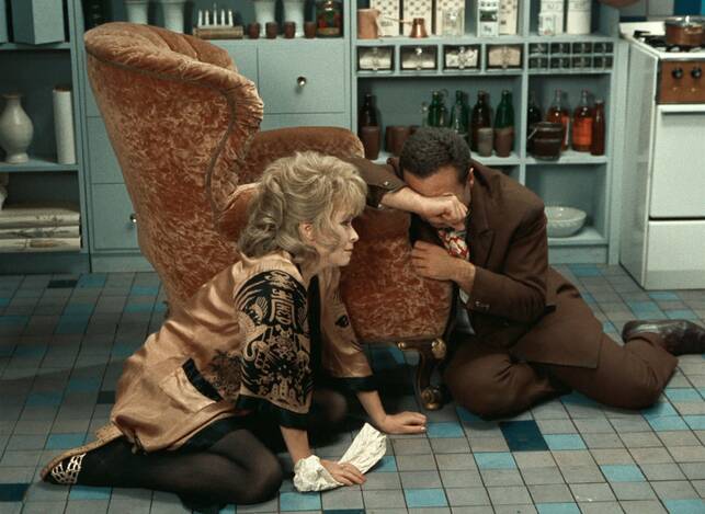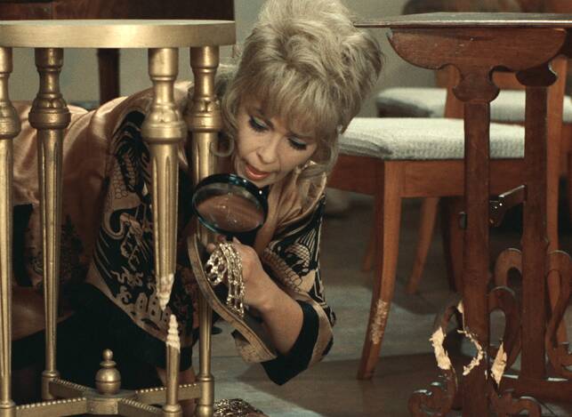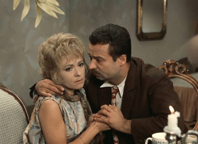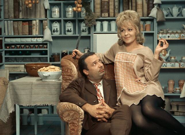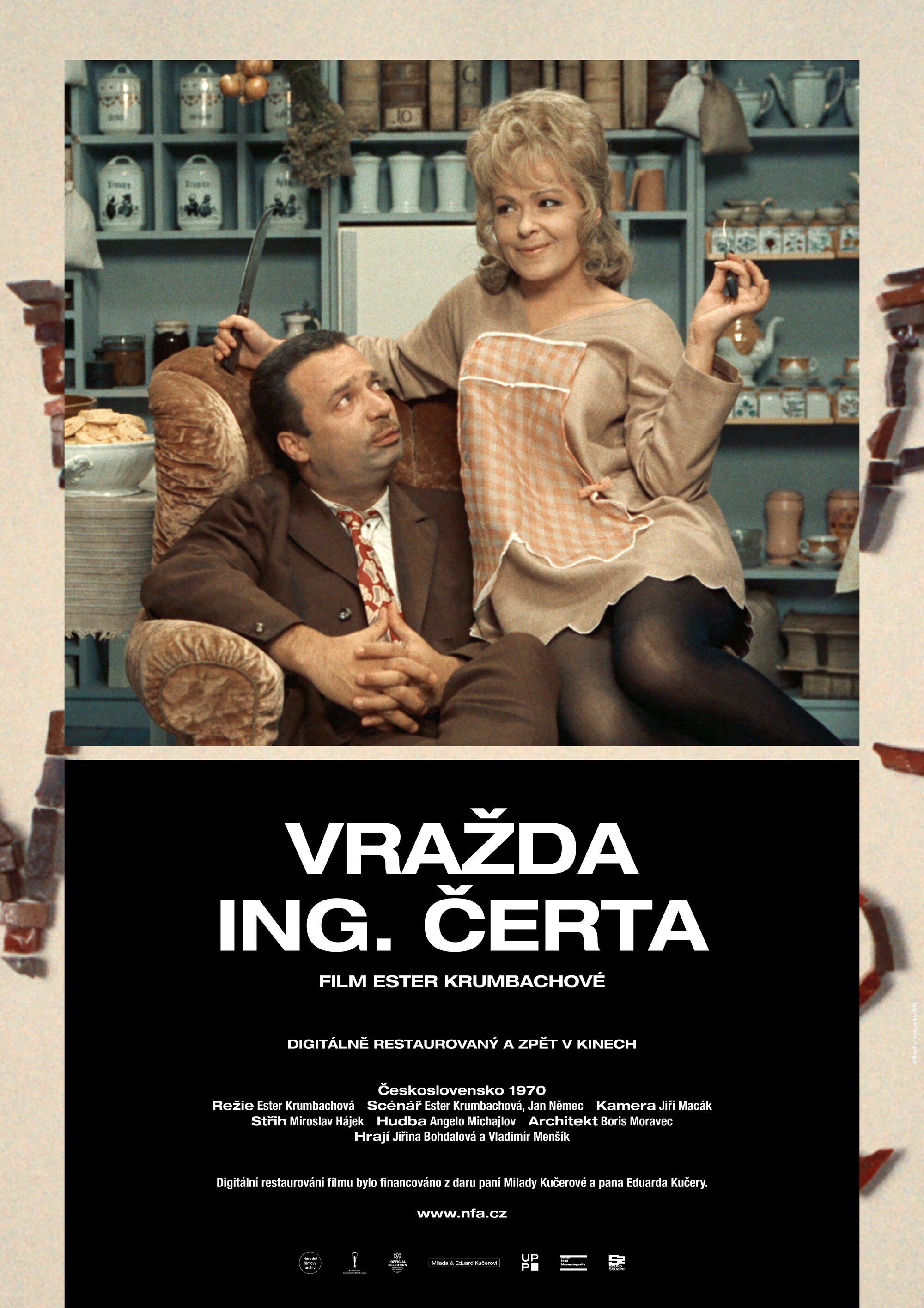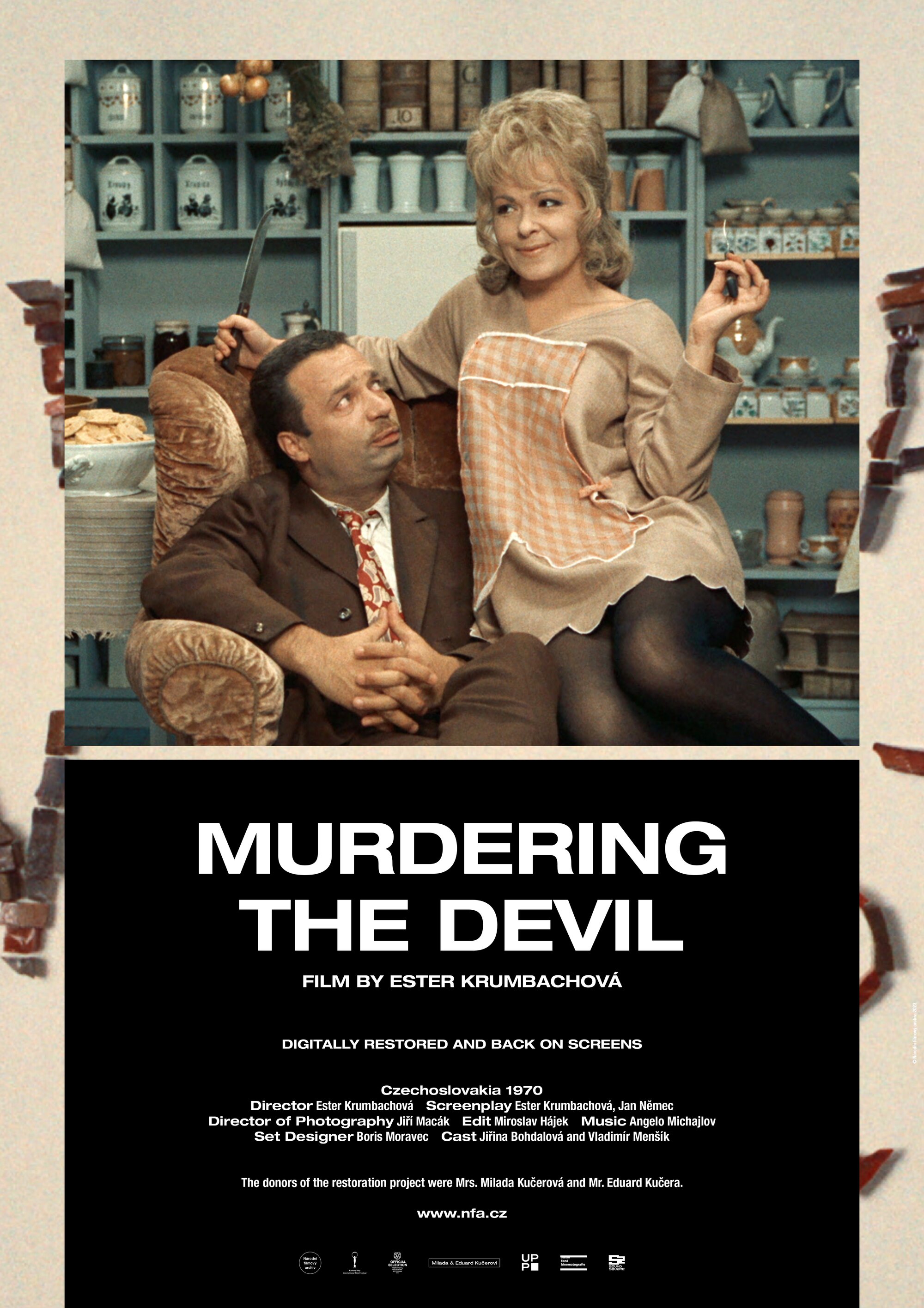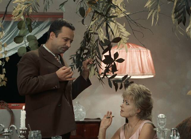 Screenwriter and costume designer Ester Krumbachová entered the world of film directing just once, to create Vražda ing. Čerta (Murdering the Devil, 1970). The main reason why the highly original film remained her only motion picture was the cruel onslaught of post-1968 “normalisation” in the country. The author, who imbued numerous films of the Czechoslovak New Wave with a dynamic visual character through her visual designs, showed an affinity with the spirit of the 1960s through her scripts for Sedmikrásky (Daisies, 1966), Ovoce stromů rajských jíme (We Eat the Fruit of the Trees of Paradise, 1969) and Valerie a týden divů (Valery’s Week of Wonders, 1970). With the help of veteran screenwriter Jan Němec, Krumbachová also penned the script for Vražda ing. Čerta. The film is a complete and mature debut that includes the period’s feminism, fortified with a peculiar form of sinister criticism with which Krumbachová targets both sexes, much as did another female director, Věra Chytilová. The nameless central character of the narrative, a pretty, clever and refined fortysomething, referred to simply as She, strives to escape her loneliness through an association with Bohouš Čert (whose surname means “Devil”), a friend from her youth. However, he is not as she had remembered him: the slim youth has become an overweight, ill-mannered man whose prominent trait is excessive voracity (closely followed by excessive garrulity). She endures Čert’s visits only by holding on to the vision of an eventual marriage to which she is willing to sacrifice her own dignity. When it emerges that the insatiable glutton – who can’t resist taking bites out of furniture legs – is indeed the devil himself, She is forced to do away with the interloper with the help of a bag of raisins… Though Krumbachová contributed to numerous highly intellectual films of the 1960s (before adding Faunovo velmi pozdní odpoledne [Faun's Delayed Afternoon], directed by Chytilová in 1983), her film is a mannerist play about the battle of the sexes, depicting with ornamental flourishes the incompatibility of men and women. The main characters are mere pieces on a chessboard, but they come alive through masterful acting by Jiřina Bohdalová and Vladimír Menšík.
