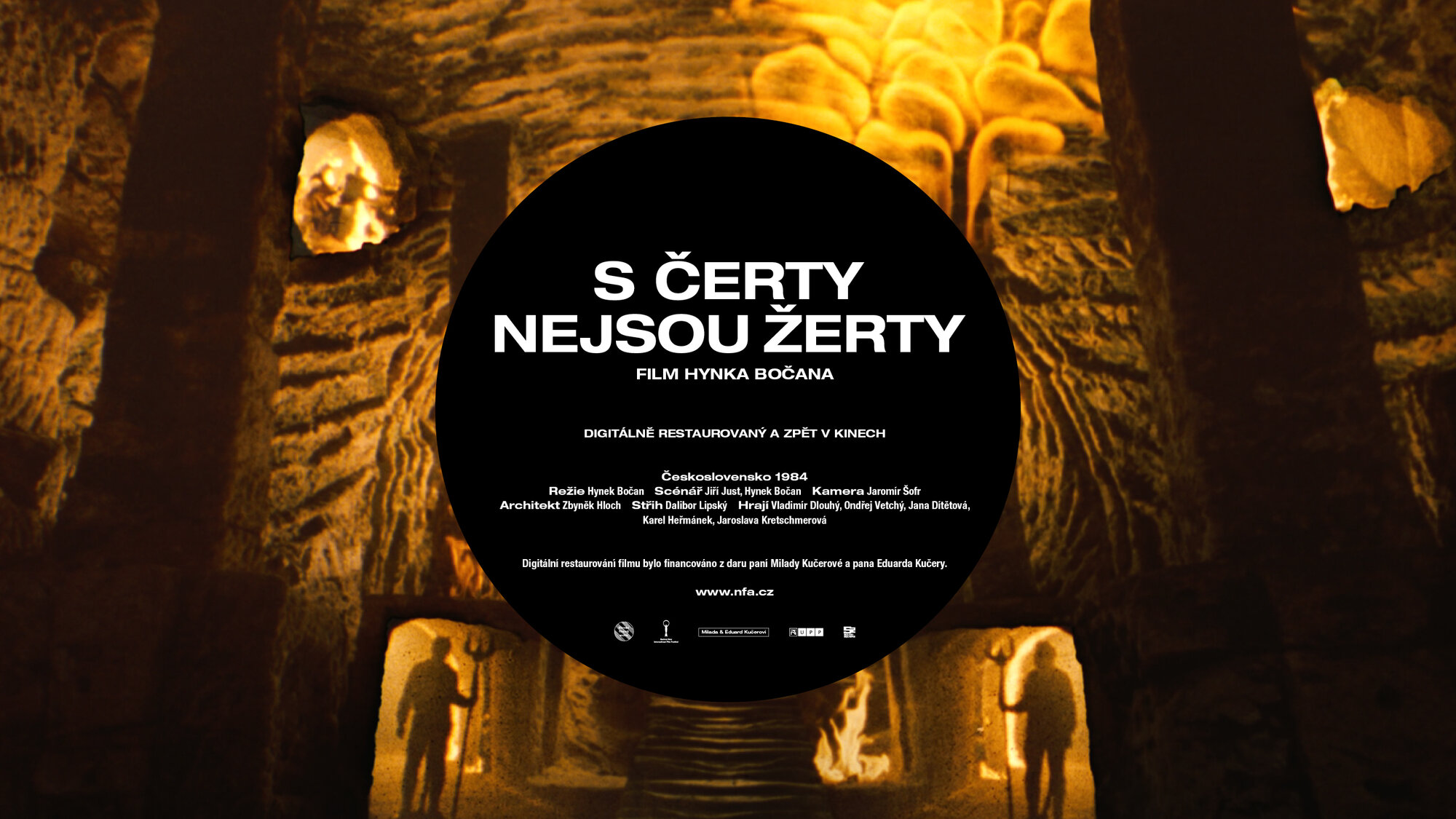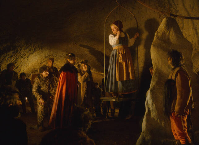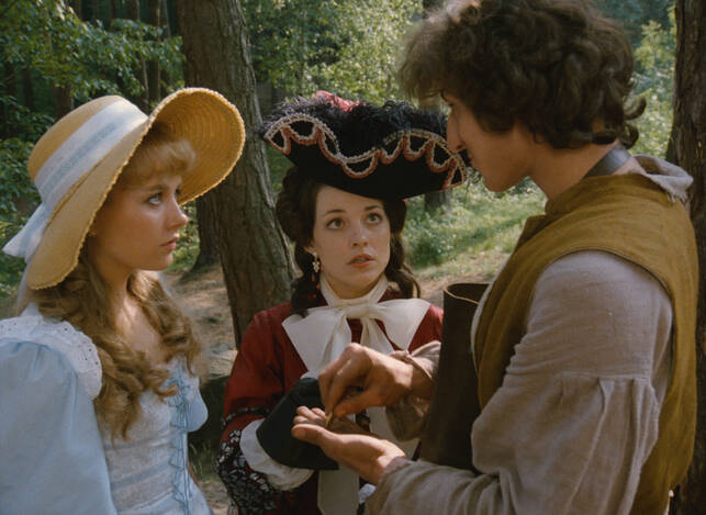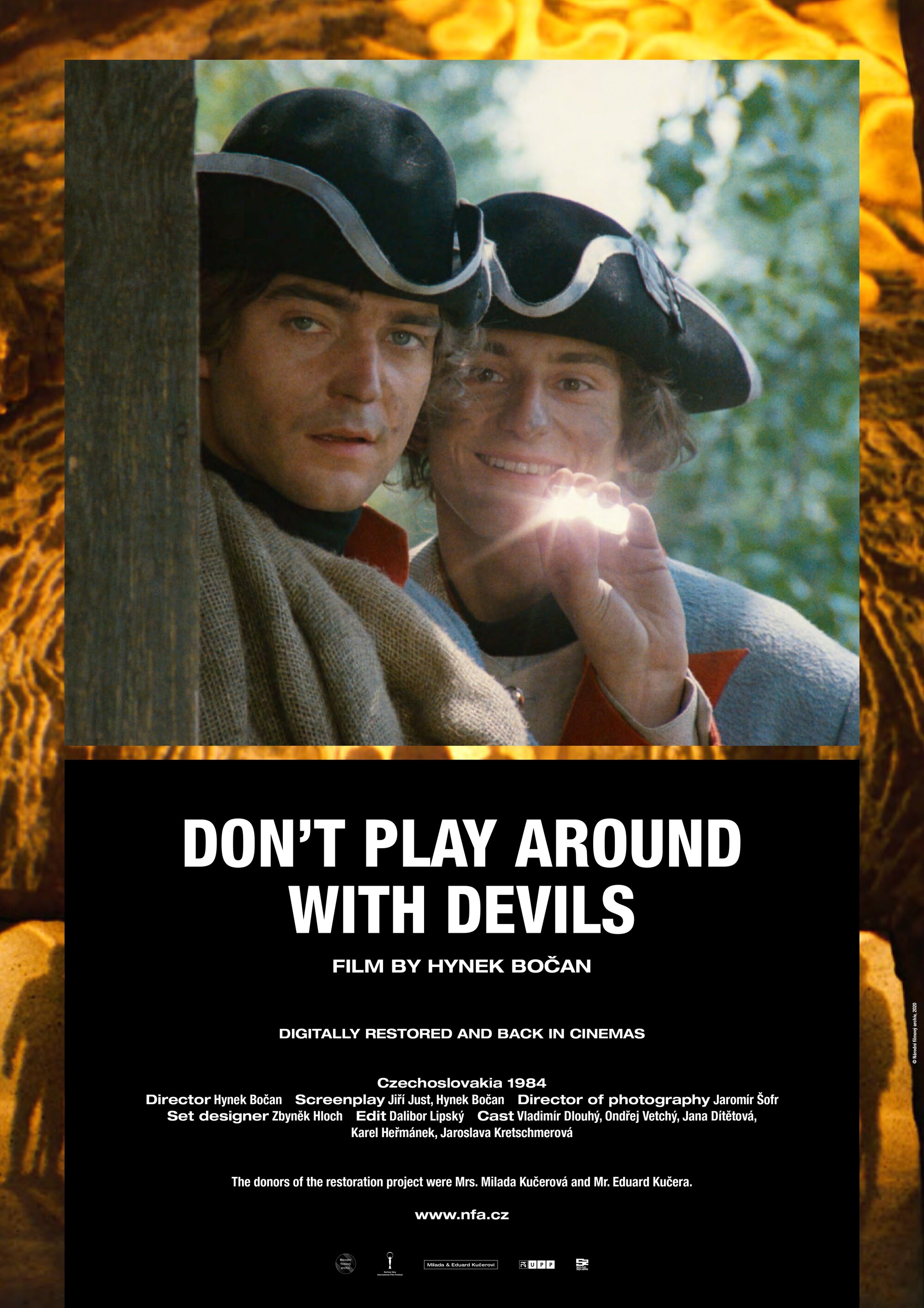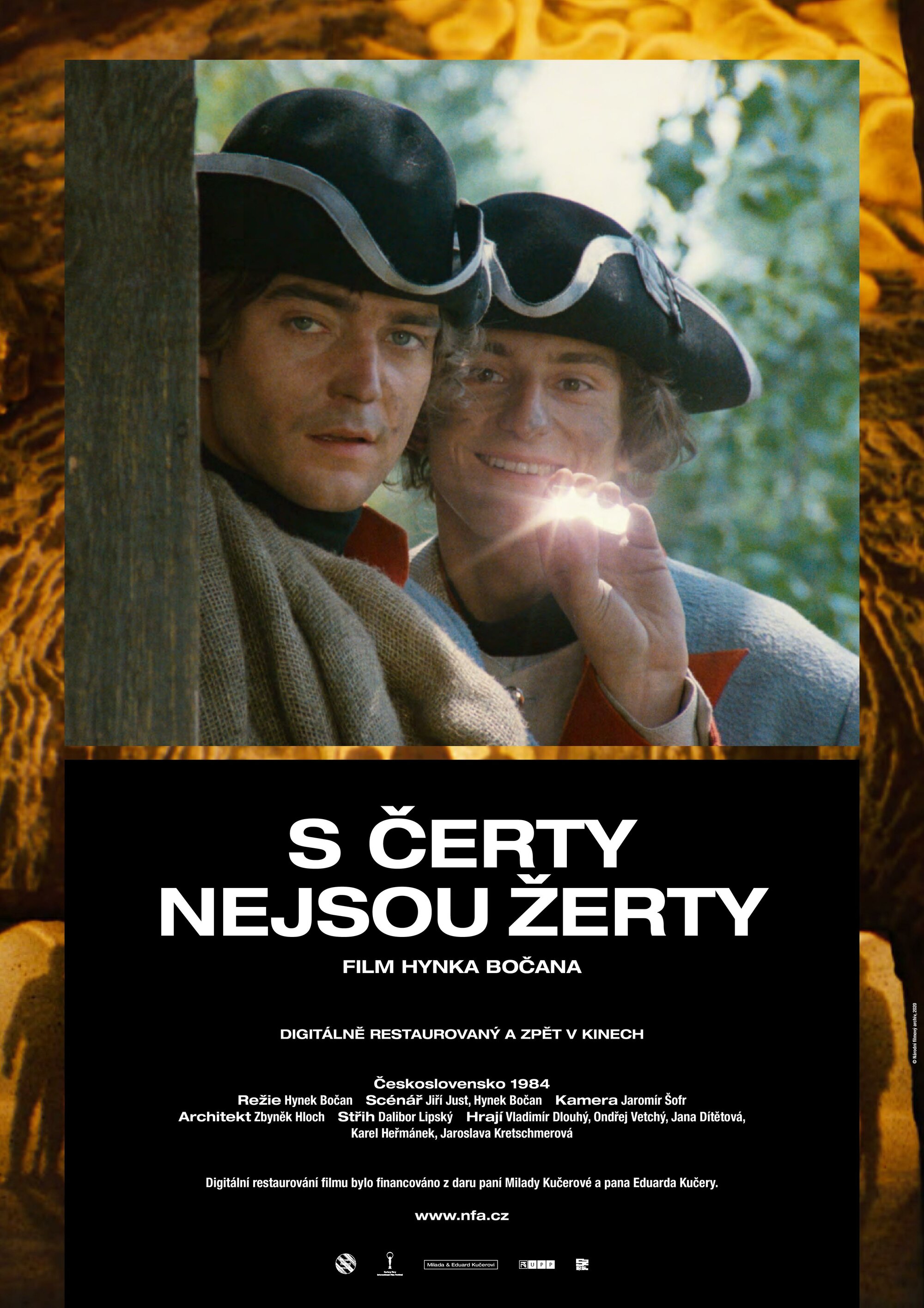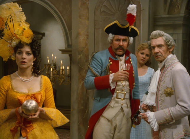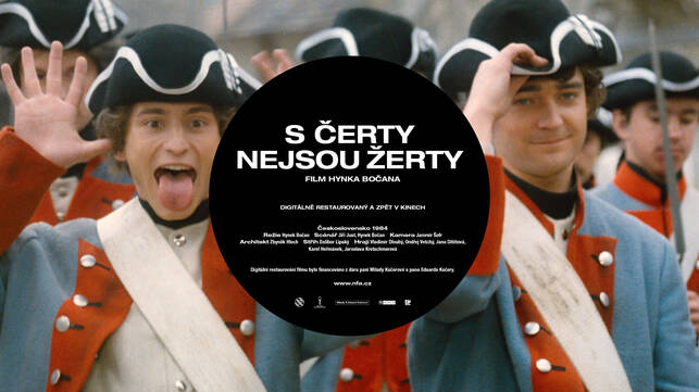 Božena Němcová´s fairytale Čertův švagr (The Devil´s Brother-in-Law) has inspired several film adaptations. As well as two films for television (a 1969 production directed by Věra Jordánová and a 1984 outing by Vlasta Janečková), its storyline was also used to create S čerty nejsou žerty (Don’t Play Around with Devils, 1984), a diabolic comedy directed by Hynek Bočan. The screenplay, written in collaboration with Jiří Just, derives much of its comedy from an appealing depiction of Hell and its fiendishly entertaining inhabitants. The mightiest figure in the underworld is Prince Lucifer XIV. He uses his dark powers to help the young hero of the tale, Petr the miller, find happiness. In doing so, he must vanquish the greedy Dorota, who tries to take over the old mill, and then punish the rapacious governor who has ruined the princedom. He also helps his young protégé to become rich and to obtain the love of Adélka, the beautiful daughter of a local prince… In Bočan’s successful reworking of the fairytale, the devils do not merely serve as agents of darkness or comical fools but also as custodians of justice who help the people stand up against their evil and greedy adversaries. However, the true hero of this merry tale is the young miller Petr, who achieves happiness not only by means of a magical coat producing an endless supply of gold coins, but also because of his bravery and cunning. Don’t Play Around with Devils was a popular fantasy film among children thanks to intelligent humour that did not underestimate its audience. The narrative employs a traditional fairytale morality unhampered by considerations of age, sex, social status or background. Cameraman Jaromír Šofr and composer Jaroslav Uhlíř also made significant contributions to the film’s success. The versatile Vladimír Dlouhý starred as Petr. Karel Heřmánek (Lucifer XIV) and Ondřej Vetchý (Janek) played the devils with obvious zeal. Petr Nárožný also stole a scene as the nettlesome corporal who tries in vain to turn Petr and Janek into soldiers.